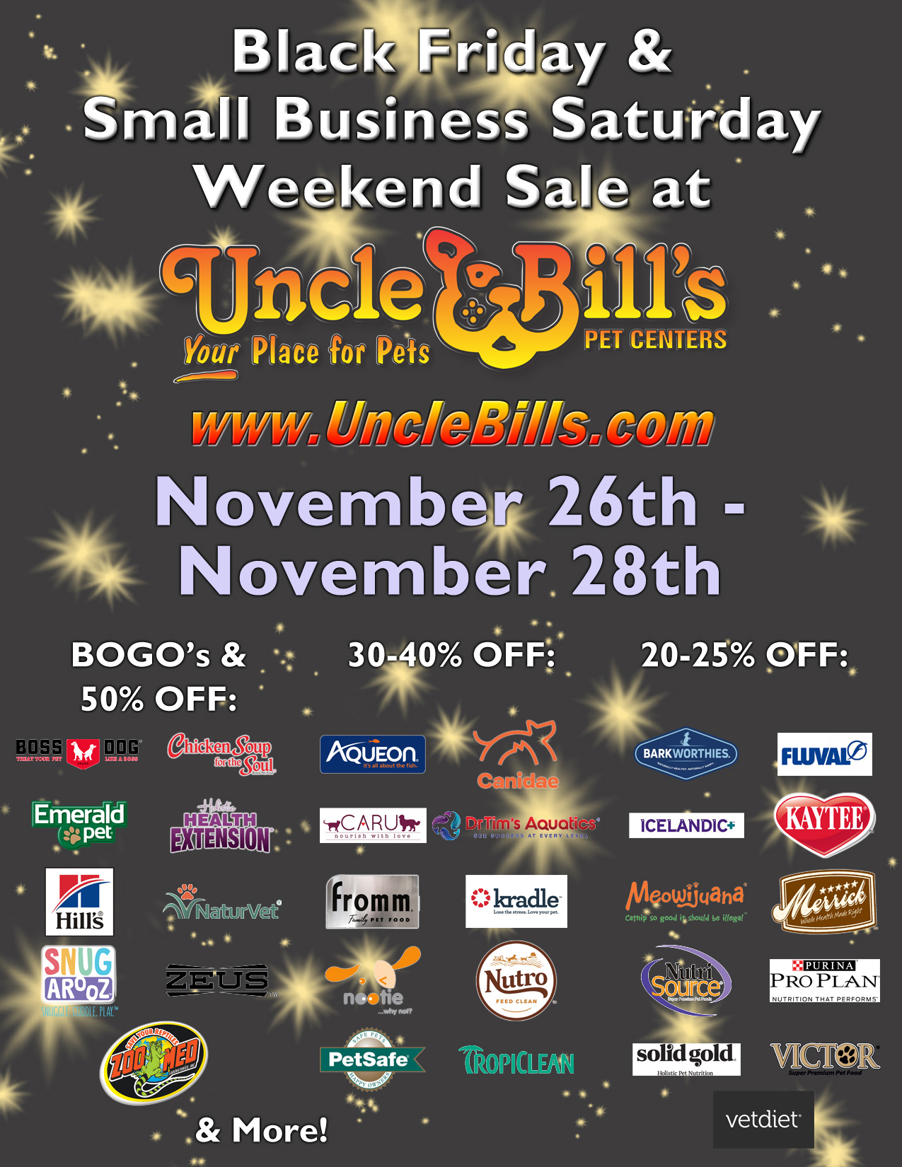 Huge Savings November 28th through November 30th at Uncle Bill's Pet Centers!