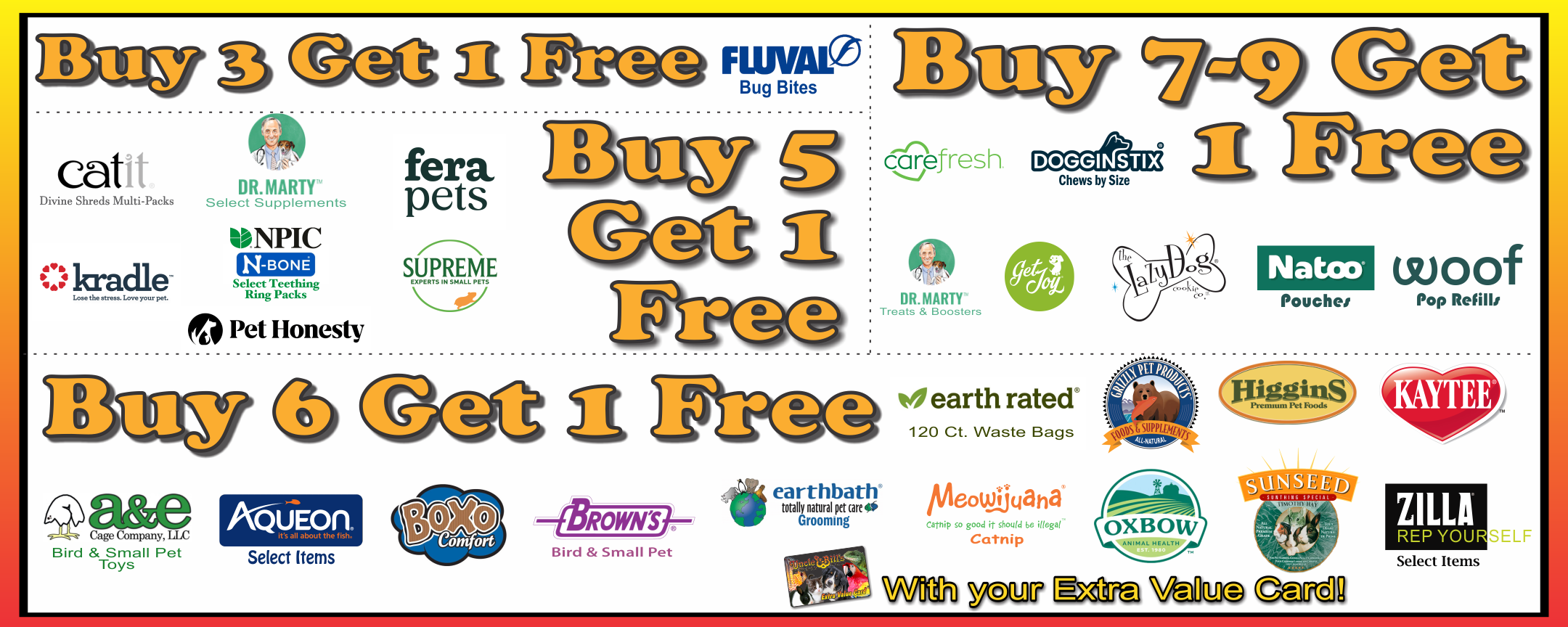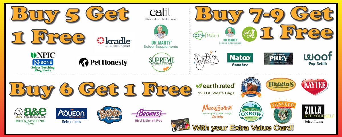 Earn FREE pet food & other necessities by purchasing your pet's favorite products of the same brand and similar size (Small, Medium, or Large Item Size.) For each size of item purchased included in the programs below you earn 1 point, and once you meet the required number of points you will receive your next applicable item for FREE with your Extra Value Card.*