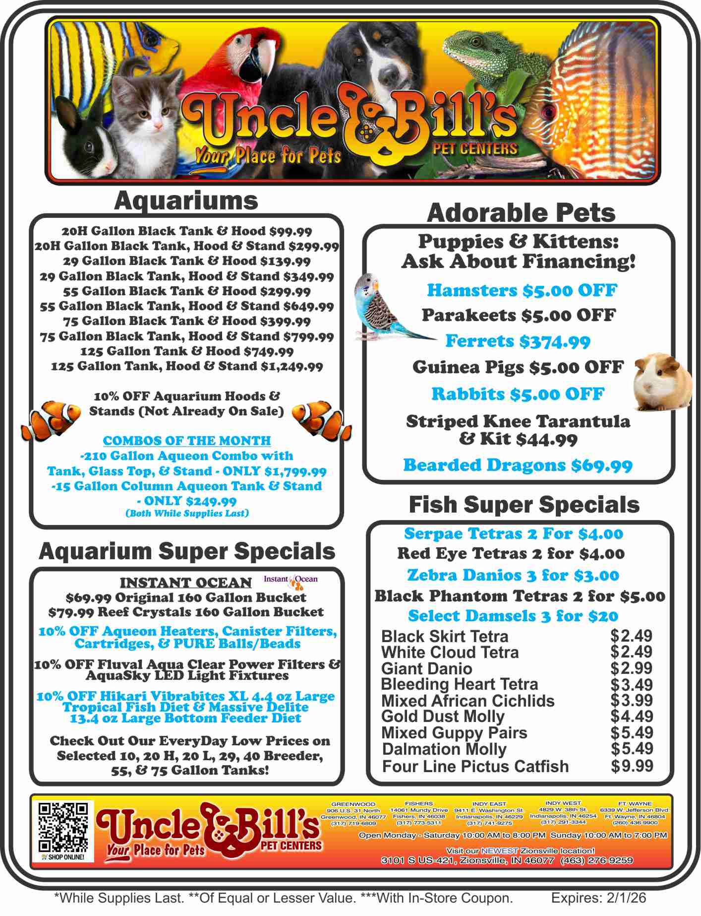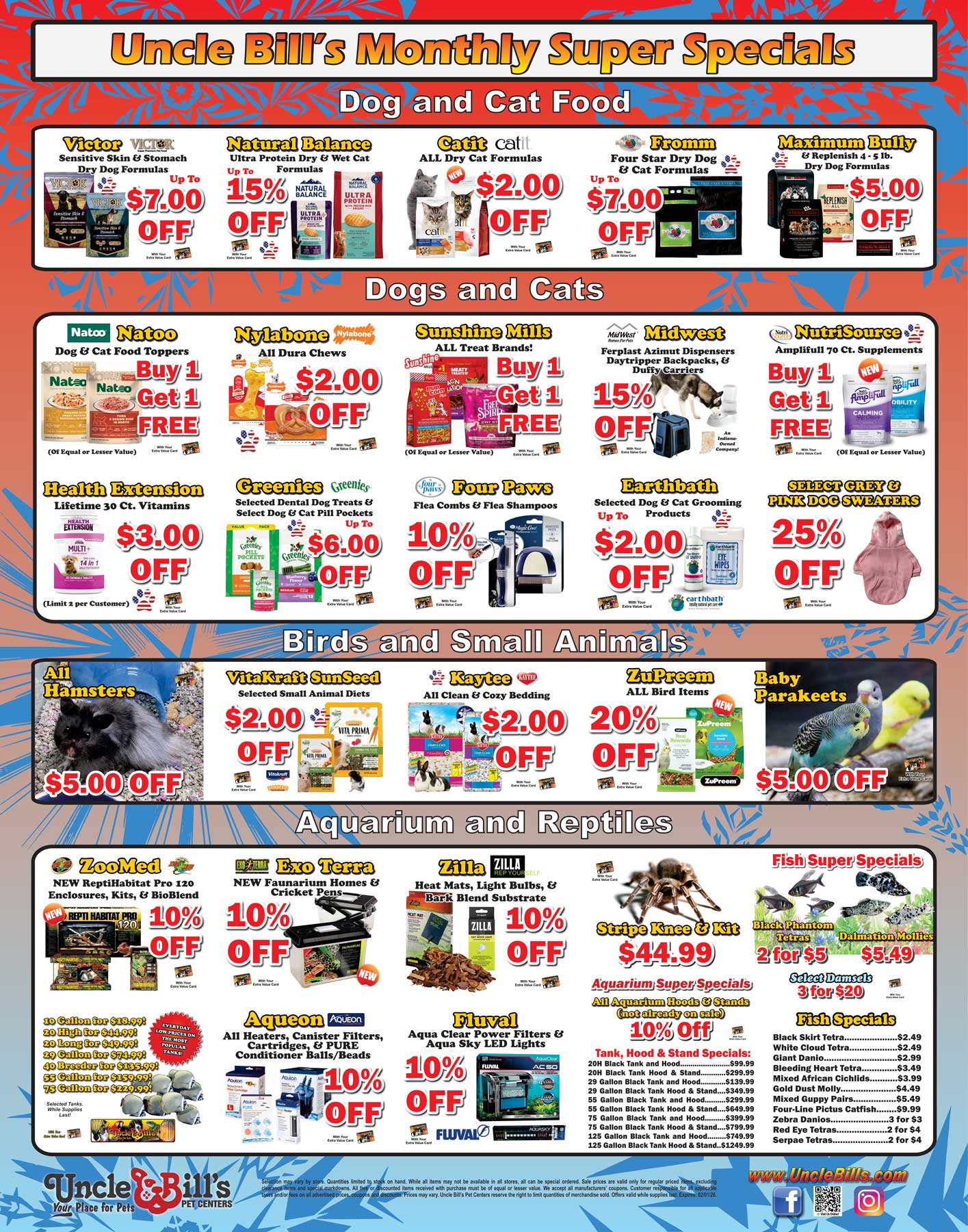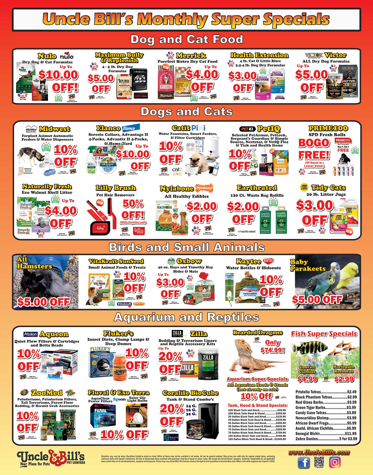 At Uncle Bill’s, we have incredible pets and pet supplies, and we want our customers to experience the best deals on everything we have to offer. We create a selection of product specials where you can find pet supplies on sale as well as deals on our adorable pets.