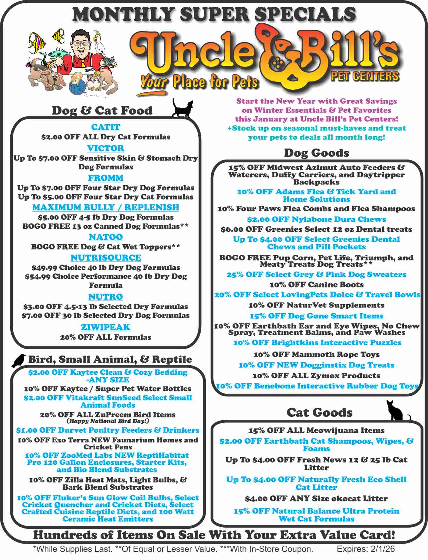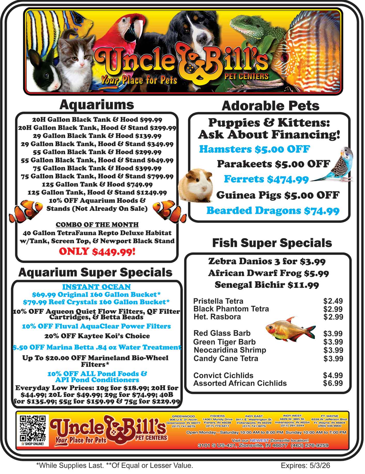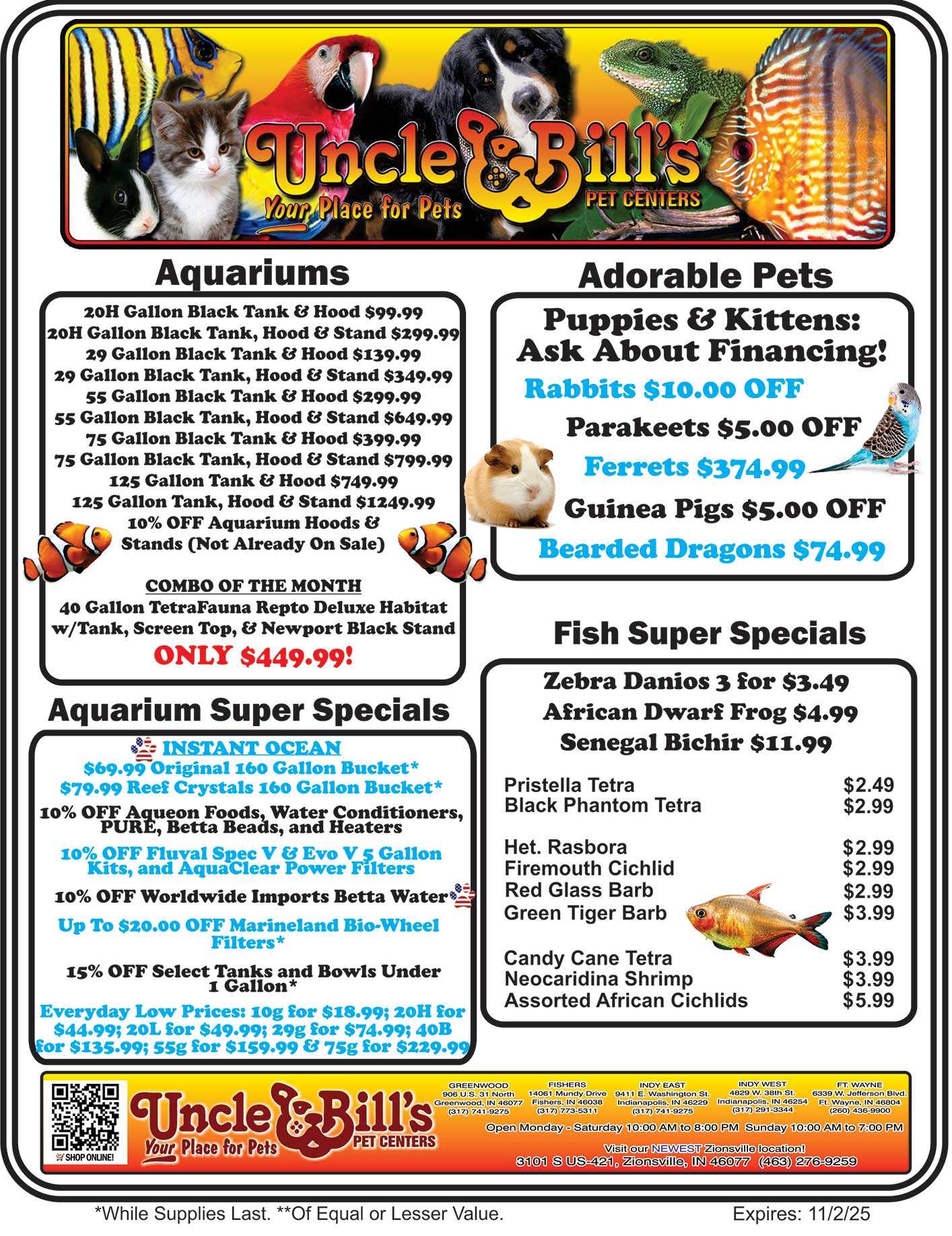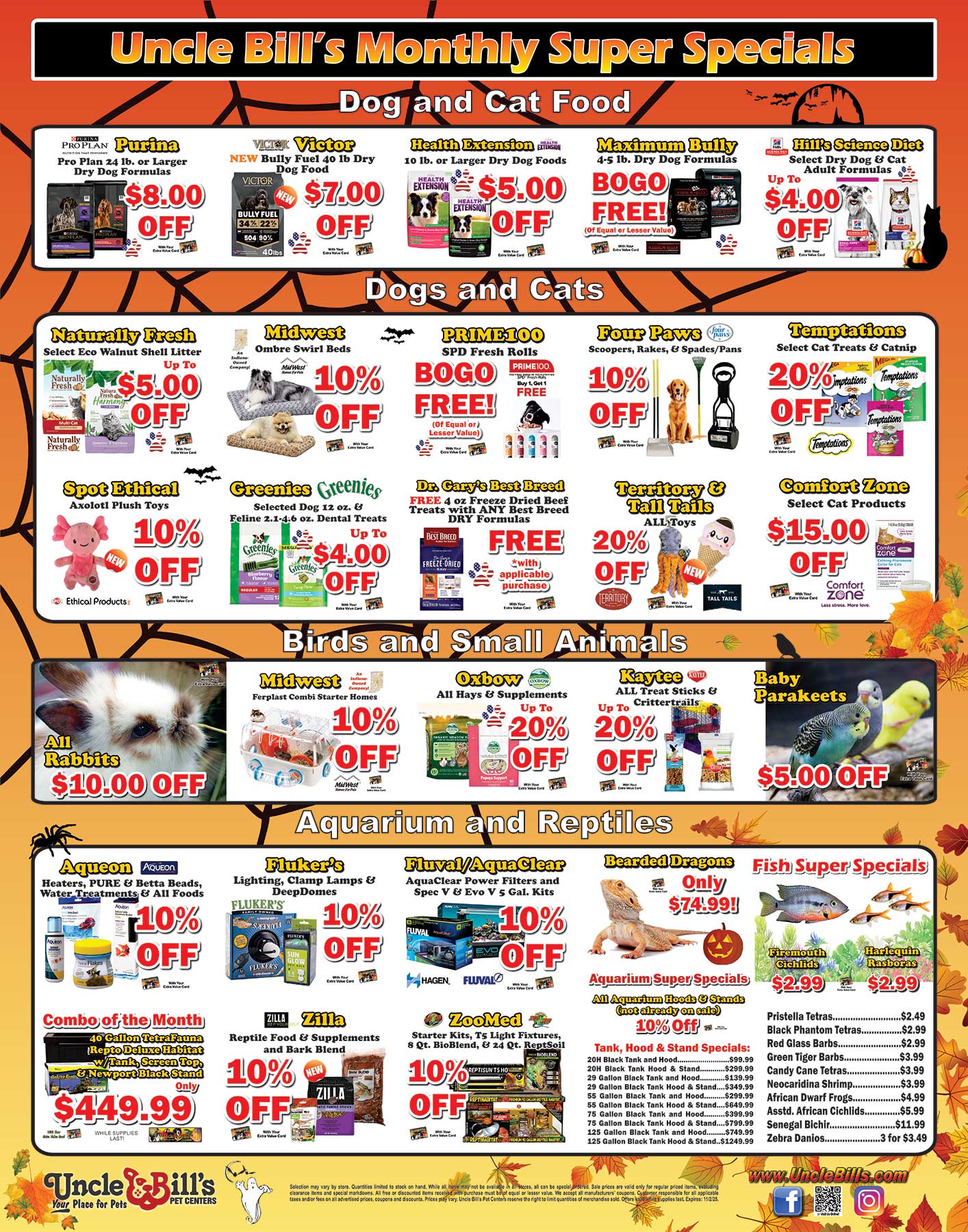 At Uncle Bill’s, we have incredible pets and pet supplies, and we want our customers to experience the best deals on everything we have to offer. We create a selection of product specials where you can find pet supplies on sale as well as deals on our adorable pets.